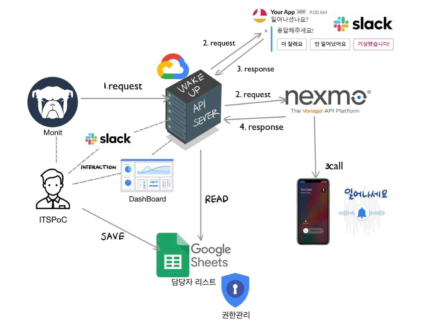 ꡬ글 μ‹œνŠΈμ— 관리λ₯Ό μœ„ν•œ μ΅œμ†Œν•œμ˜ κ³„μ •λ§Œ 곡유 λ“±λ‘ν•˜μ—¬ κ΄€λ¦¬ν•œλ‹€. WakeUpAPI μ„œλ²„λŠ” ꡬ글 μ‹œνŠΈ API λ₯Ό μ‚¬μš©ν•˜μ—¬ μ„œλΉ„μŠ€/μ„œλ²„ κ΄€λ¦¬μžλ“€μ˜ μ „ν™”λ²ˆν˜Έ 정보λ₯Ό κ°€μ Έμ™€μ„œ μ „ν™”/λ©”μ„Έμ§€λ₯Ό μ‹€ν–‰ν•œλ‹€.