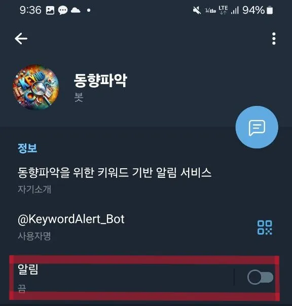 A. 동향파악 봇이 보내는 알림을 조용히 만들 수 있습니다. 키워드 매칭 되는 글들은 수신 받지만, 새로운 글의 숫자만 보이면, 알림은 울리지 않습니다.